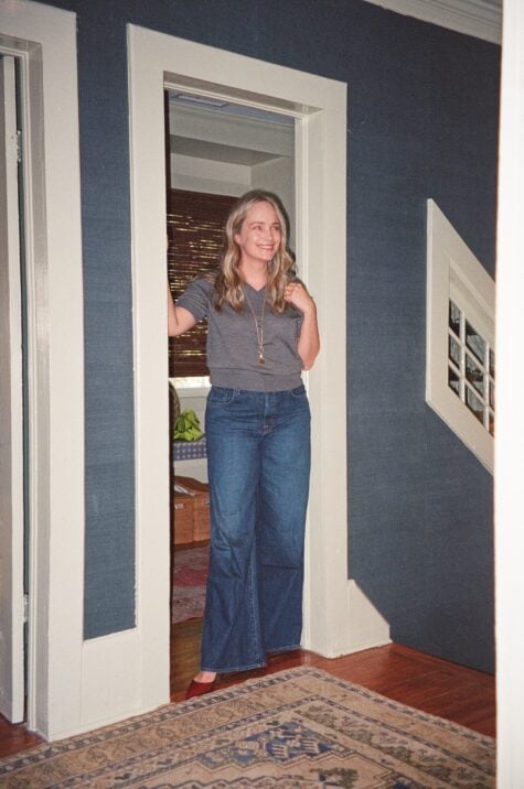 I really love this oversized denim shirt. I sized up to a large – you want this to be so big that it drapes.