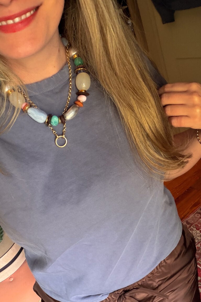I can’t help but think that my grandmother (and great aunts!) would be thrilled about some of this year’s trends. Of course, there’s all the nineties influence (they’d likely skip right over that and laugh at us), but brooches and silk scarves are both so big, and I know that if they were around, they’d be so happy. We discussed brooches in this post (plus loads of styling ideas in this reel!), and today I wanted to chat about scarves. Personally, I think the most chic way to wear a silk scarf is to use it as a necklace. Wear something simple as a blank canvas to let it shine. I love this Theory sweater because it has the smooth feel of a neoprene sweatshirt but the cut of a sweater, so it still feels polished.