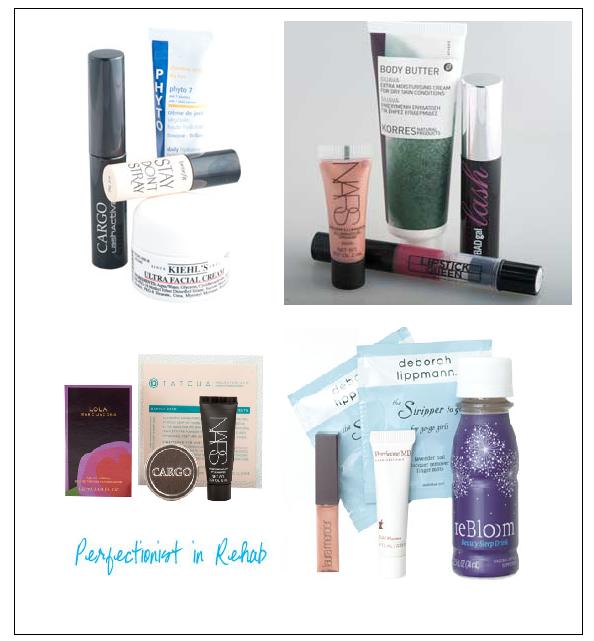 Each month, the box arrives, beautifully gift-wrapped… it’s sort of like getting a present. And it seems like the boxes just keep getting better and better. This month we received the perfect neutral lip gloss (Laura Mercier Lip Glace in Opal,) a fabulous face cream (Perricone MD Cold Plasma,) a super moisturizing shampoo/conditioner combo (Oribe Moisture and Control formula,) polish remover towelettes from Deborah Lippmann, and an all natural sleep aid drink called reBloom. It may have been a coincidence but it felt like this box in particular was tailored just to me… I’m seriously hooked on each one of them. (Below is a collage of previous Birchbox offerings.)
