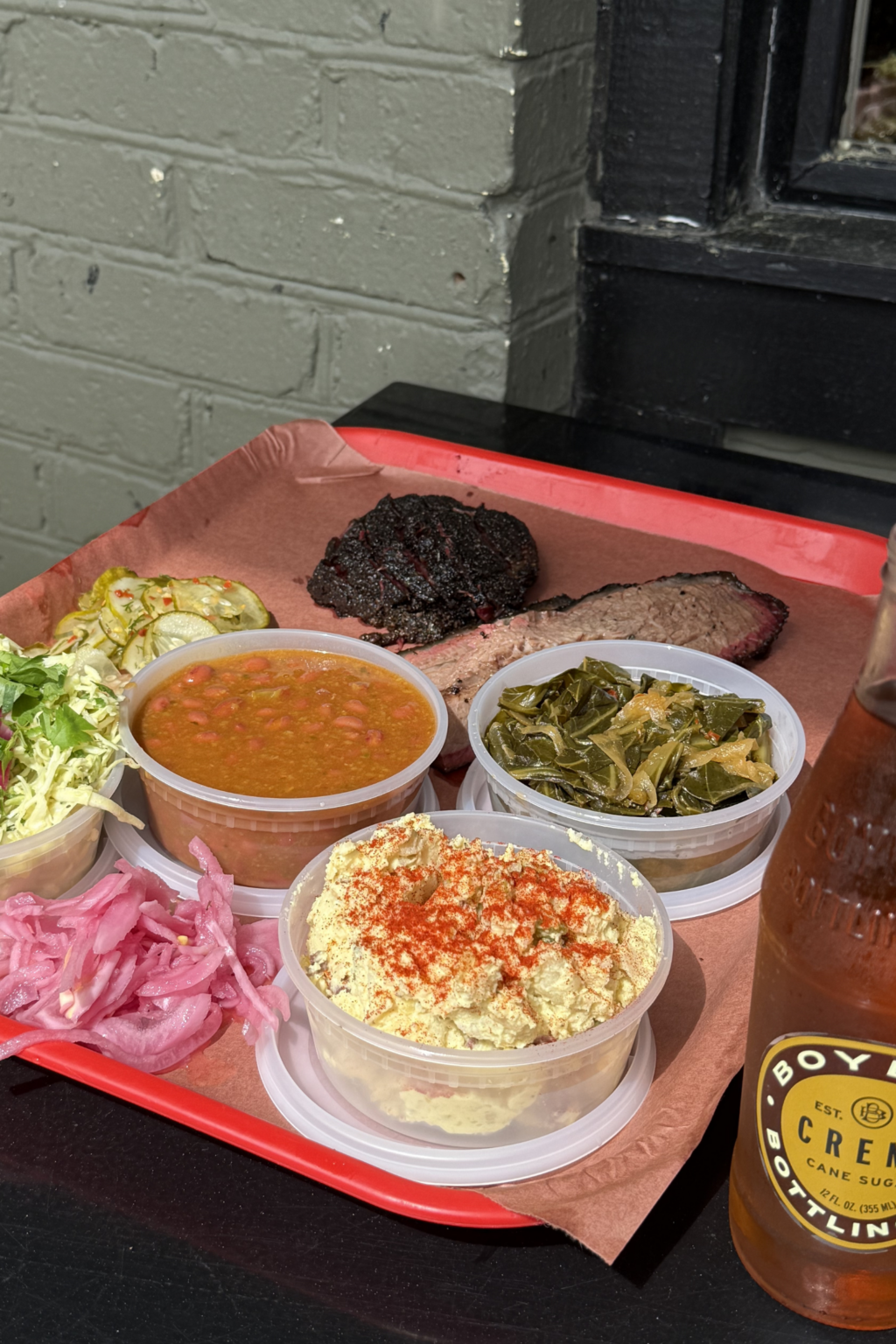 What landed on my tray felt like the right kind of overcommitment: beef cheeks, brisket, potato salad, mustard slaw, collard greens, and, without exaggeration, some of the best beans I’ve had in recent memory. A proper spread. And because restraint was clearly not part of the agenda, an ice-cold Boylan’s creme soda to round it all out.