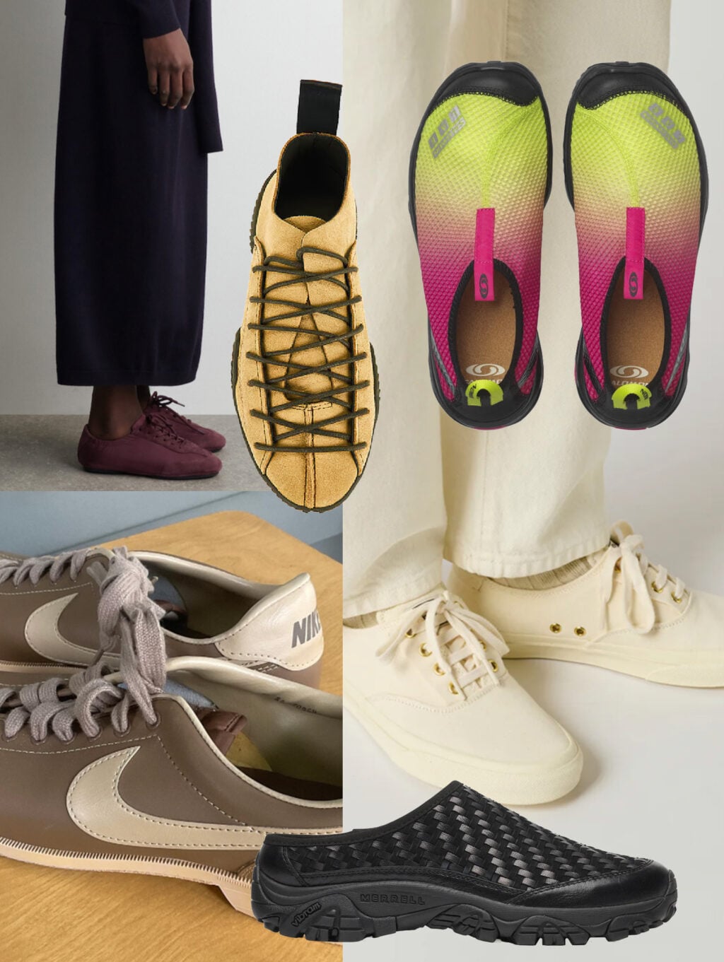 I keep circling back to a suede lace-up pair from Miista, and, as always, a trusty Salomon sneaker that could easily double as a water shoe. And yes, in case you were wondering, Merrells are absolutely creeping back into the conversation. I’ve got my eye on a pair of their slides as we speak. If the weirder end of the spectrum isn’t quite your thing, the ballet sneaker or a classic plimsoll feels like an easy way to dip a toe in without fully committing.