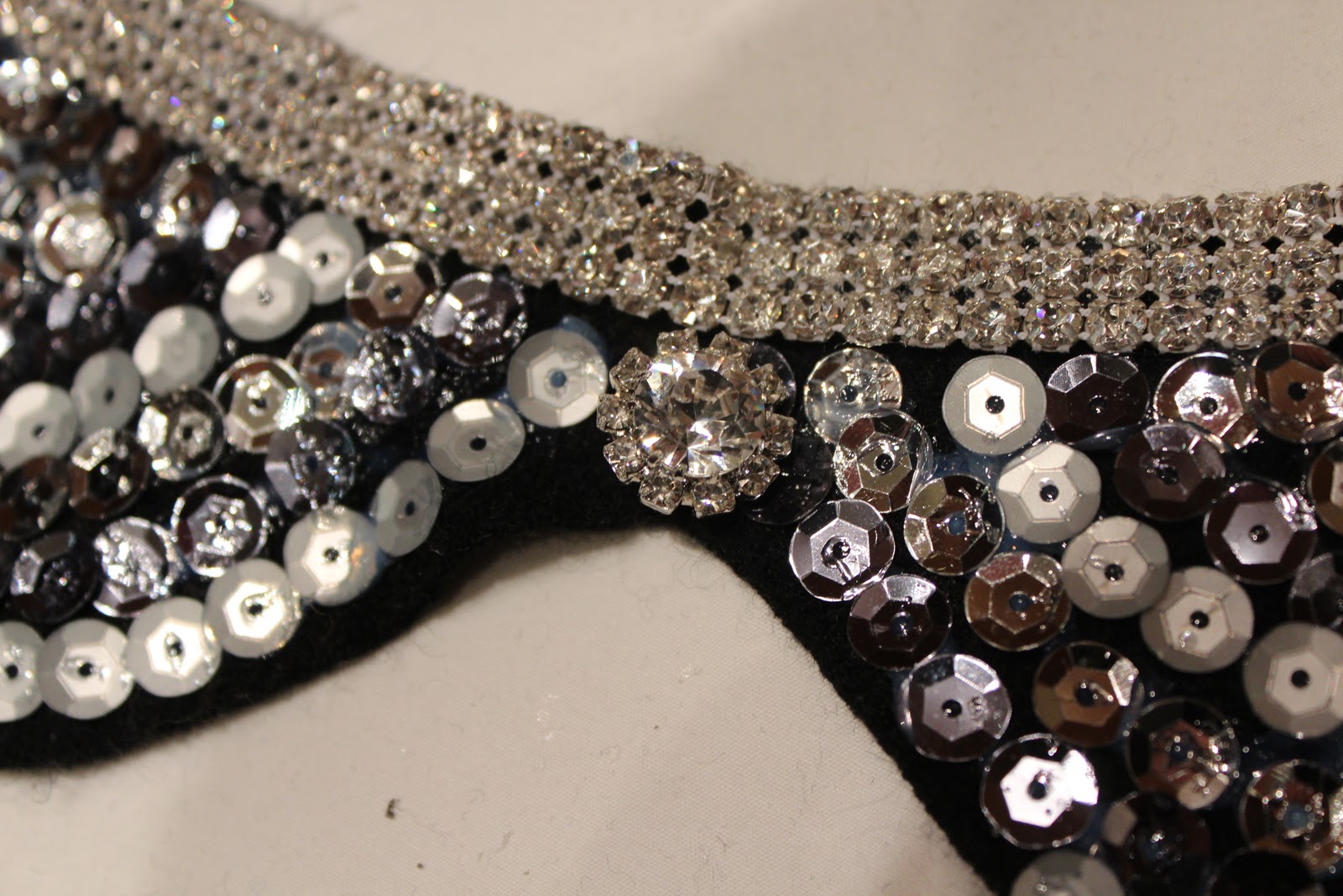 Using a glue gun, adhere the rhinestone trim to the top of the collar. Note: I have a general aversion to glue guns. In this case, you have to mold the trim to the collar… the glue gun is the easiest way to do it. Sewing would be tricky, and fabric/gem glue would dry funny. The glue gun is the best option. I recommend reinforcing it later with a few stitches.