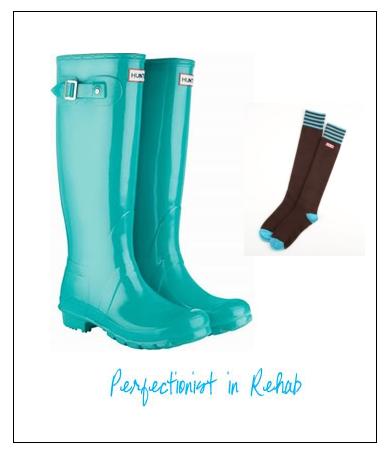 Totally obsessed with these glossy tall rainboots from Hunter… (isn’t the turquoise color just fab?) But when I found out they made matching socks, I went completely nuts! So cute. Brown and turquoise already look great together… and picture the stripes peaking out of the tops of the boots… paired with a fabulous trench? Voila – Rainy Day Perfection.