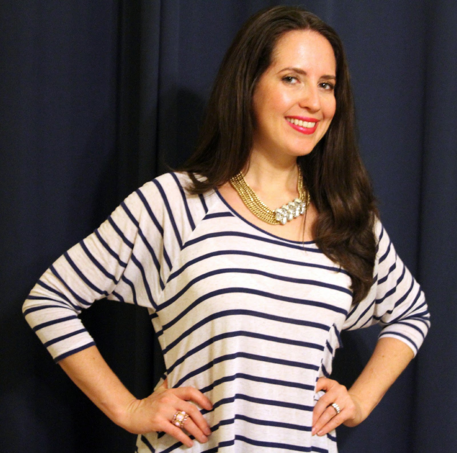 What was this style challenge you ask? She asked me to incorporate two of her very favorite things, stripes and sequins, into an outfit. So, I headed to my wardrobe and came up with a striped Forever 21 tunic, William Rast for Target skinny cargo pants, ancient Payless glitter pumps, my newly acquired BaubleBar Chevron Necklace, stacked rings from Francesca’s and a vintage mesh evening bag. So, how did I do? Ok…It may not exactly qualify as stripes and sequins…but it could definitely fit into the stripes and sparkles category! Don’t you think?
