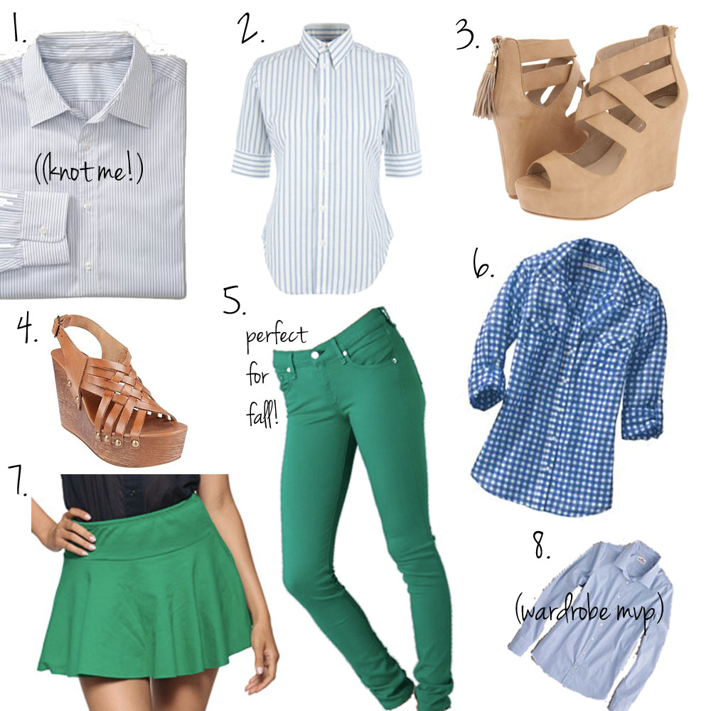 On my way home from work today, I saw one of the cutest outfits ever… so simple, but so perfect. A kelly green mini, paired with a blue & white striped oxford shirt. She accessorized with simple wedges and a cute cross-body bag. Love.