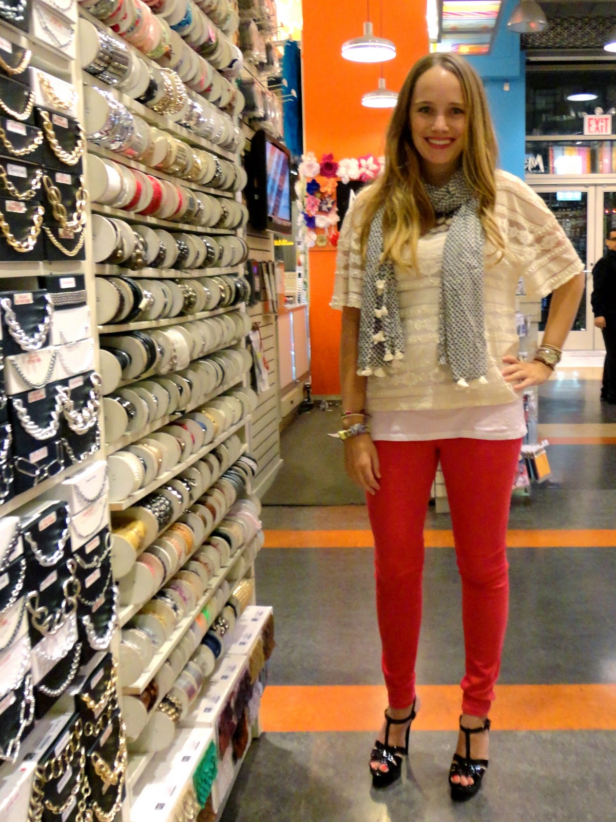 Patterson J. Kincaid Lace Tee (similar), Yummie Tummie Tank, J. Crew pom pom scarf (similar), Gap Skinny Jeans, YSL Patent leather tribute sandals (similar) Pretty hair via The Dry Bar, red lips c/o Maybelline Red Revolution!