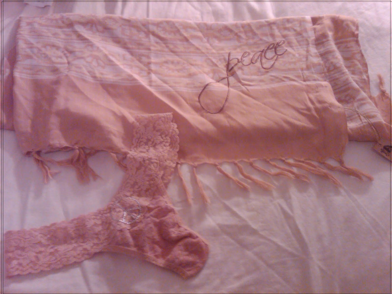 I never win anything. But then my luck changed – I entered Hanky Panky & Satya Rai’s Peace in 2010 giveaway a week or so ago and I actually won! My prize came today. A gorgeous nude “Tri Manta Peace Scarf,” and a custom peace sign thong from Hanky Panky.