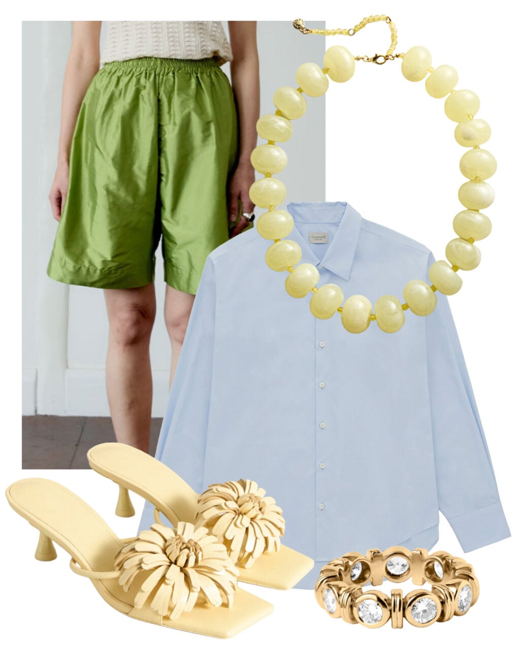 Butter yellow pairs so beautifully with chartreuse and pale blue. These slides are so at home with my taffeta shorts from Cawley and a simple Oxford shirt. Also, I saw this Dorsey ring IRL in New York, and it’s magnificent in person! Top of my wish list.