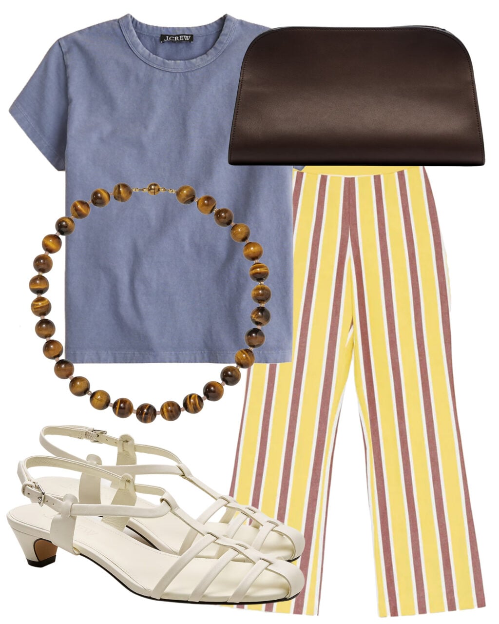 I can’t quite articulate why I love this tee so much, but I think it is because it reminds me of old J.Crew, the J.Crew I wore back in 1998. Does anyone else remember their “pigment dyed” and “sunwashed” t-shirts? This feels like it’s from that era, in the best possible way. I saw these pants on Jessie Randall and thought they were the coolest. Adding a tiger’s eye necklace makes the look feel more cohesive by adding another pop of brown. And how fun are these J.Crew sandals? J.Crew has been on fire lately!