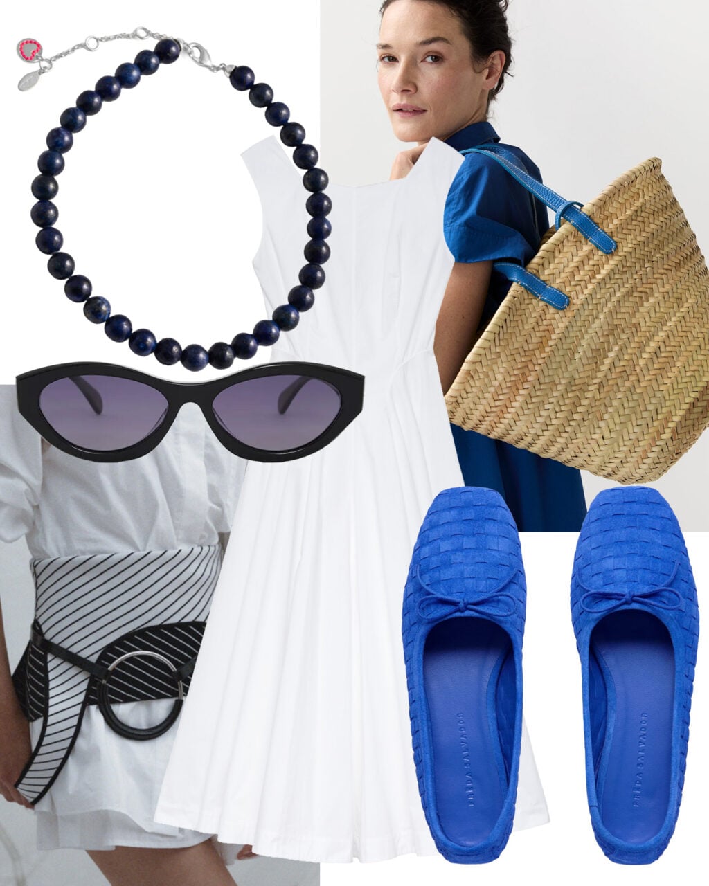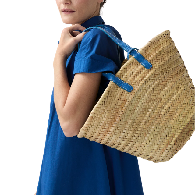 I love this last look so much. Take Dôen’s classic midi dress, layer on this tank (and fold it down over your hips), and add a pop of blue with the flats and this beautiful rattan bag. It feels a little bit out there, but in the best possible way.