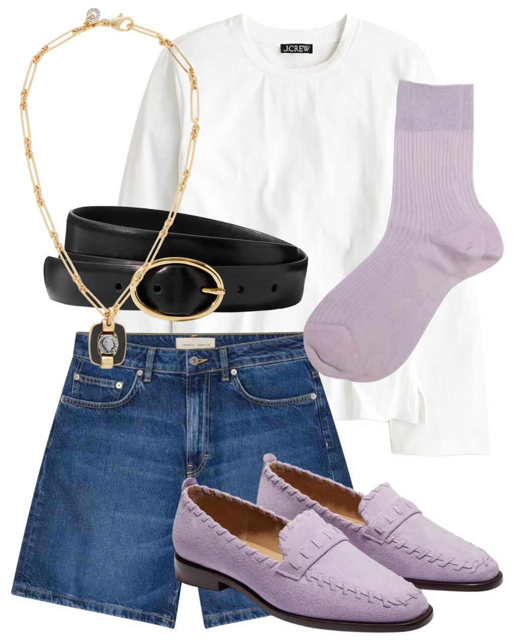 First of all, this J.Crew long-sleeve is the very best. I recommend sizing up (I got the M and the L and prefer the L as it’s a little slouchier and the shoulder has a nice drape). Keep things really simple with classic denim shorts (my favorite) and a polished belt, and then have some fun with these lilac loafers and matching socks!